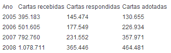 Números Desde a criação do projeto o número de correspondências vem aumentando, embora não seja esta a meta dos Correios. Abaixo, os dados dos últimos quatro anos: